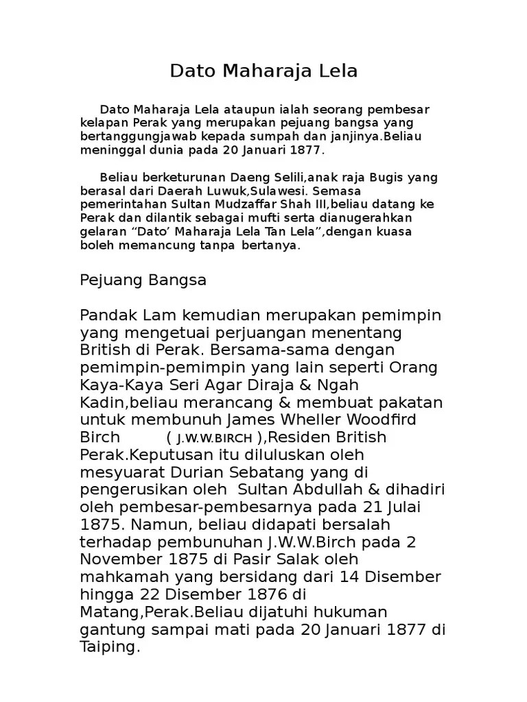 Beliau tidak mahu mengotorkan dirinya menjadi pencacai british, sebaliknya dengan penuh strategi dan umpamanya mempertahankan sistem tradisional di perak yang. Moga pemergian dato' maharaja lela akan melahirkan lebih ramai lagi semangat dan jiwa kental di negeri perak seperti beliau. Menentang british kerana british memperkenalkan sistem cukai baharu dan campur tangan. Help us build our profile of dato maharaja lela! Sk dato' maharaja lela terletak di kawasan luar bandar dan mempunyai bilangan guru sebanyak 106 orang dan bilangan murid sebanyak 1498 orang.