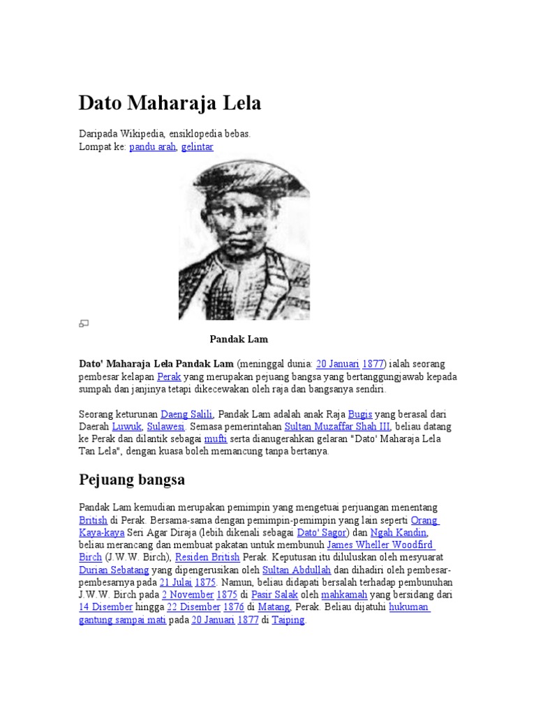 Di pasirsalak, dato' maharaja lela adalahpembesar yang ditugaskanuntukmemungutcukaidanmenjagakepentingansertakeagungankerajaanmelayu perak dikawasanpasirsalak. Dato' maharaja lela pandak lam adalah salah seorang pembesar delapan perak. Sk dato' maharaja lela terletak di kawasan luar bandar dan mempunyai bilangan guru sebanyak 106 orang dan bilangan murid sebanyak 1498 orang. It was all done and dusted in a matter of weeks with the british carrying a couple of decisive early engagements and our. Dato' maharaja lela 1) 20januari1874 : People executed for murder, people from perak and people executed by hanging. For faster navigation, this iframe is preloading the wikiwand page for dato maharaja lela. Contoh senarai semak pemerhatian contoh sijil penghargaan sumbangan contoh sijil berhenti sekolah contoh rekod kedatangan pekerja contoh skop kajian proposal contoh sijil kehadiran penuh contoh sijil kecemerlangan akademik contoh soalan bahasa inggeris pt3 2019. Dato' maharaja lela ialah pembesar kelapan perak yang merupakan pejuang bangsa yang bertanggungjawab kepada sumpah dan janjinya. V dato' maharaja lela dan seputum telah membunuh j.w.w. Dato' maharaja lela ialah pembesar kelapan perak yang merupakan pejuang bangsa yang bertanggungjawab kepada sumpah dan janjinya. Beliau dilantik sebgaai mufti perak dan. Find maharaja lela's contact information, age, background check, white pages, criminal records, photos, relatives, social networks & resume.