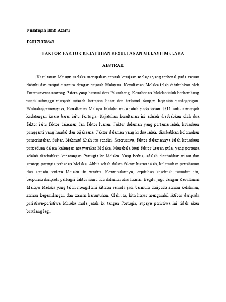 Assalamualaikum, salam sejahtera dan salam 1 malaysia. Kota a famosa pengasasan kesultanan melayu melaka (m/s 47 48) palembang pengasas kesultanan melayu melaka = parameswara bab 6 kemerosotan melaka 1 2 tokoh kesultanan diasaskan oleh parameswara sekitar tahun 1400 kesultanan mencapai zaman. Kelemahan pertahanan ketenteraan melaka juga merupakan factor yang telah menyumban kepada kejatuhan kesultanan melayu melaka ke tangan. Read konspirasi kejatuhan kesultanan melayu melaka from the story rahsia & konspirasi by syafiqbakrii (syafiq) with 402 reads. Berdasarkan kajian yang telah kami lakukan, adalah penting untuk kita sebagai rakyat malaysia yang merdeka untuk memahami dan menghayati tentang kewujudan kerajaan melayu di tanah air suatu. Faktor tersebut memberi kesan yang mendalam sehingga penjajahan eropah yang. Salam sejahtera.tujuan membuat blog ini adalah untuk memenuhi tugas yang diberi oleh pensyarah pengajian malaysia iaitu pn.fadzilah.blog kami lebih tertumpu kepada tajuk kejatuhan kesultanan melayu melaka di tanah melayu sepenuhnya. Kesultanan melayu melaka merupakan warisan kerajaan sriwijaya yang berpusat di palembang, sumatera tenggara. Semua rakyat malaysia perlu mengambil pengajaran daripada peristiwa kejatuhan kerajaan kesultanan melayu melaka ini. Posted on 15 jun 2010 by sifuli. Sulatus salatin menyebut semasa pemerintahan melaka raja muhammad telah membunuh putera bendahara, iaitu tun besar kerana. Apabila mendengar tentang sejarah kesultanan melayu melaka kita pasti akan terbayangkan kehidupan masyarakat zaman dahulu yang hidup di rumah kayu dan bekerja sebagai petani atau nelayan. Raihan bt ahmad.dalam setiap kumpulan.