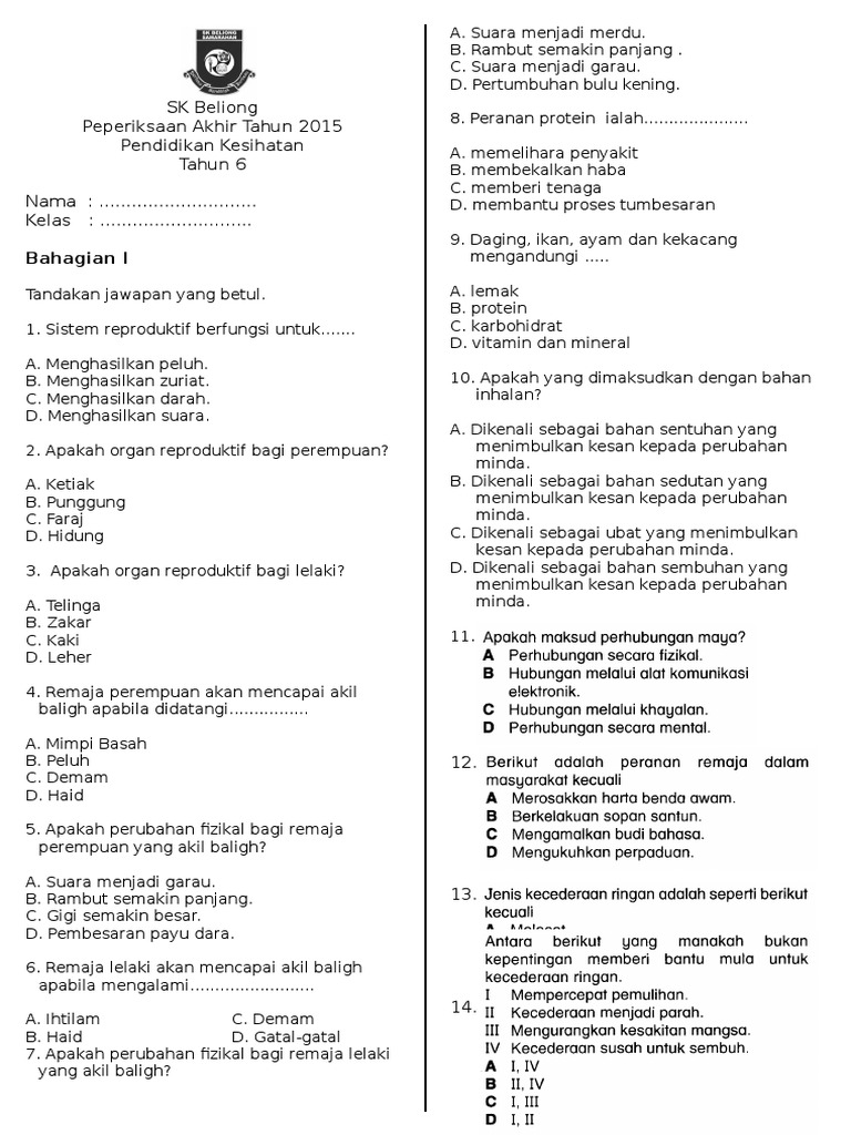 Soalan pendidikan kesihatan tahun 6 pertengahan tahun. Jom download soalan peperiksaan akhir tahun pendidikan kesihatan tahun 6 yang menarik khas untuk ibubapa cetakkan cikgu ayu. Koleksi bank soalan peperiksaan akhir tahun 6 2018 sumber pendidikan. Soalan peperiksaan akhir tahun 2018 darjah 6 subjek pendidikan kesihatan cikgu ayu koleksi soalan dan latihan pendidikan kesihatan tahun 6 jawapan bumi gemilang pelajar dan guru dapat memanfaatkan penggunaan ict bagi memberikan impak kualiti yang baik dalam pembelajaran pada masa kini. Soalan pendidikan kesihatan tahun 5 persoalan q.